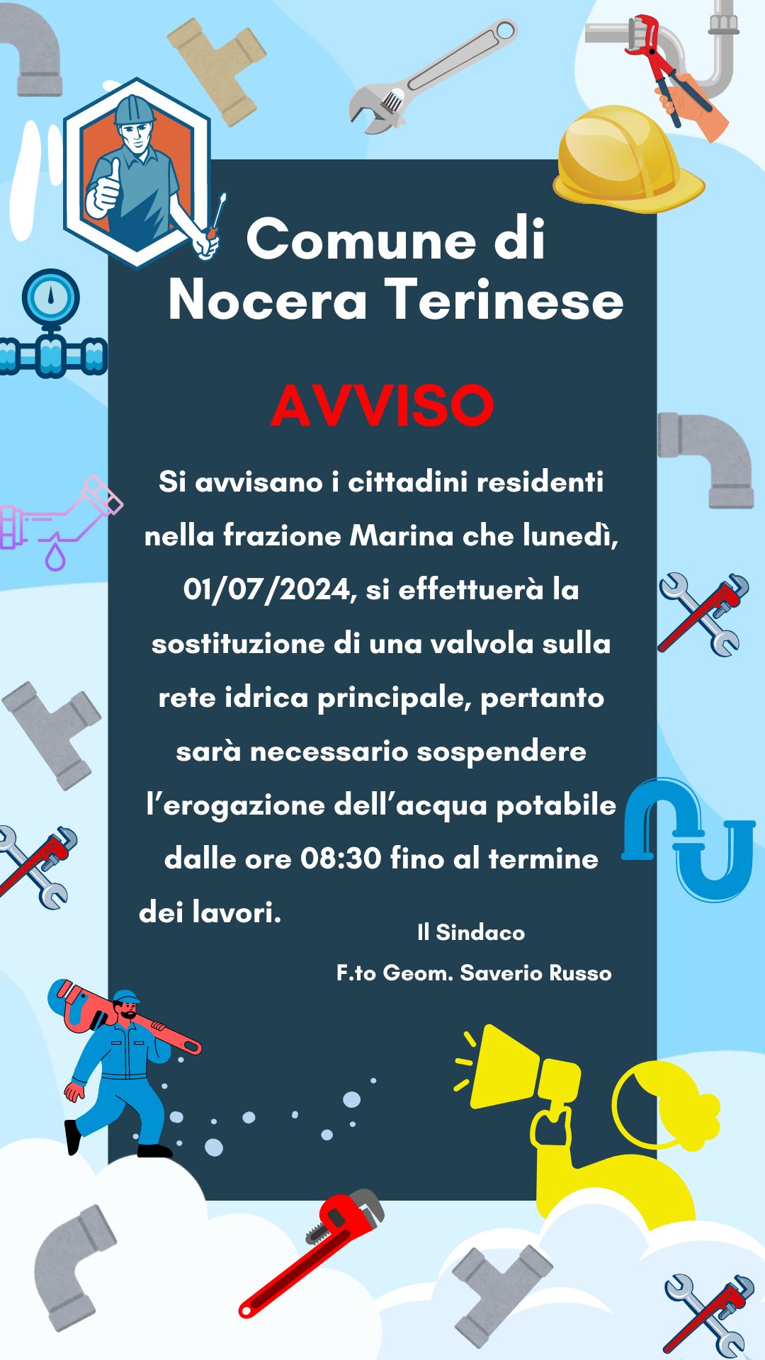 Si avvisano i cittadini residenti nella frazione Marina che lunedì, 01/07/2024, si effettuerà la sostituzione di una valvola sulla rete idrica principale, pertanto sarà necessario sospendere l’erogazione dell’acqua potabile dalle ore 08:30 fino al termine dei lavori.