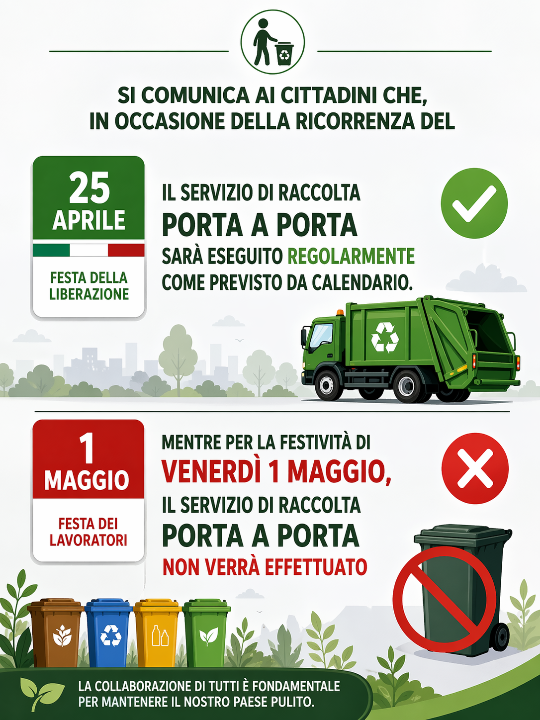 SI COMUNICA AI CITTADINI CHE, IN OCCASIONE DELLA RICORRENZA DEL 25 APRILE, IL SERVIZIO DI RACCOLTA PORTA A PORTA SARÀ ESEGUITO REGOLARMENTE COME PREVISTO DA CALENDARIO. MENTRE PER LA FESTIVITÀ DI VENERDÌ 1 MAGGIO, IL SERVIZIO DI RACCOLTA PORTA A PORTA NON VERRÀ EFFETTUATO.